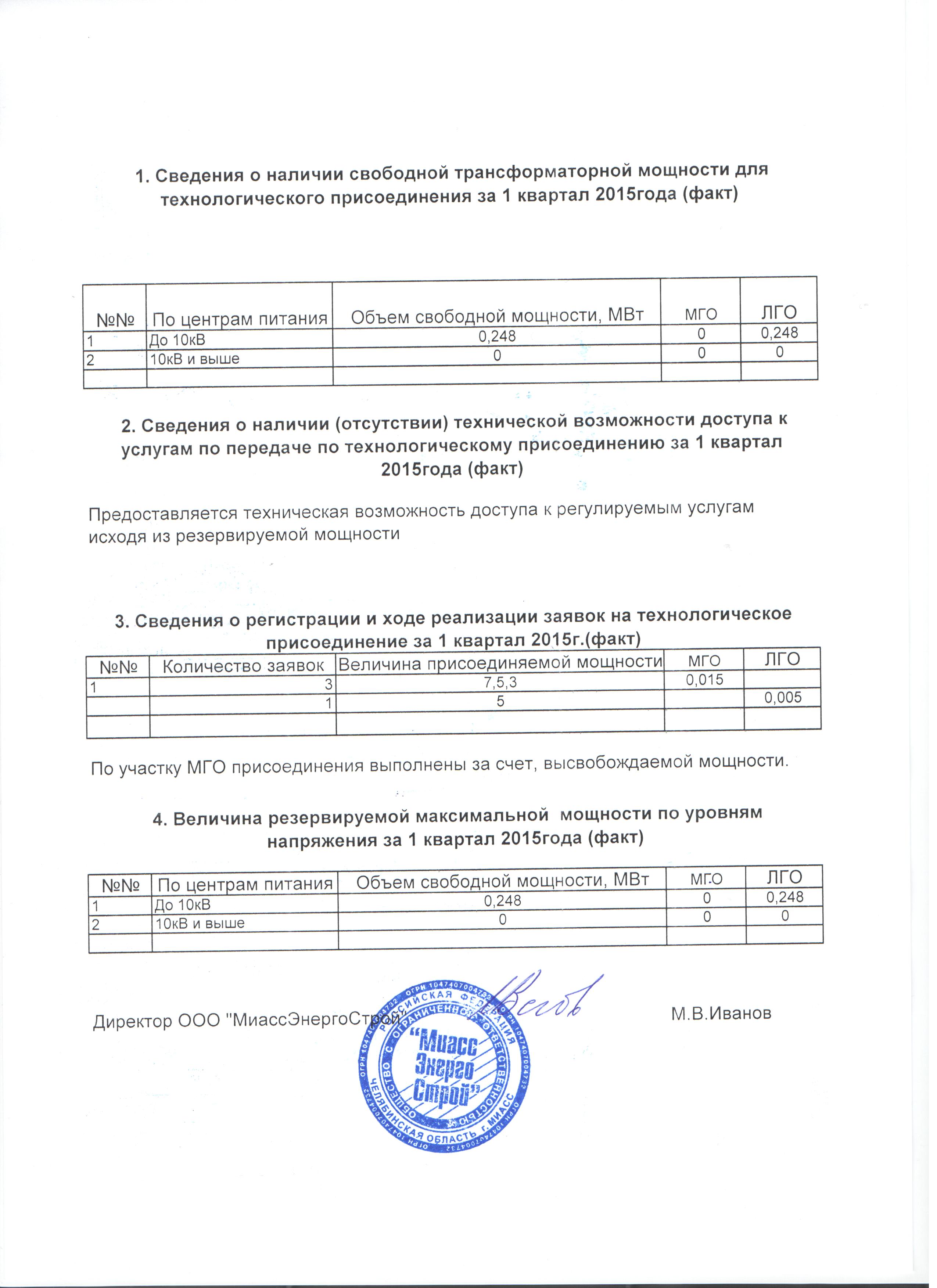 Наличие свободной, резервируемой мощности и количество поданных заявок за 1 квартал 2015 года554.32 KB