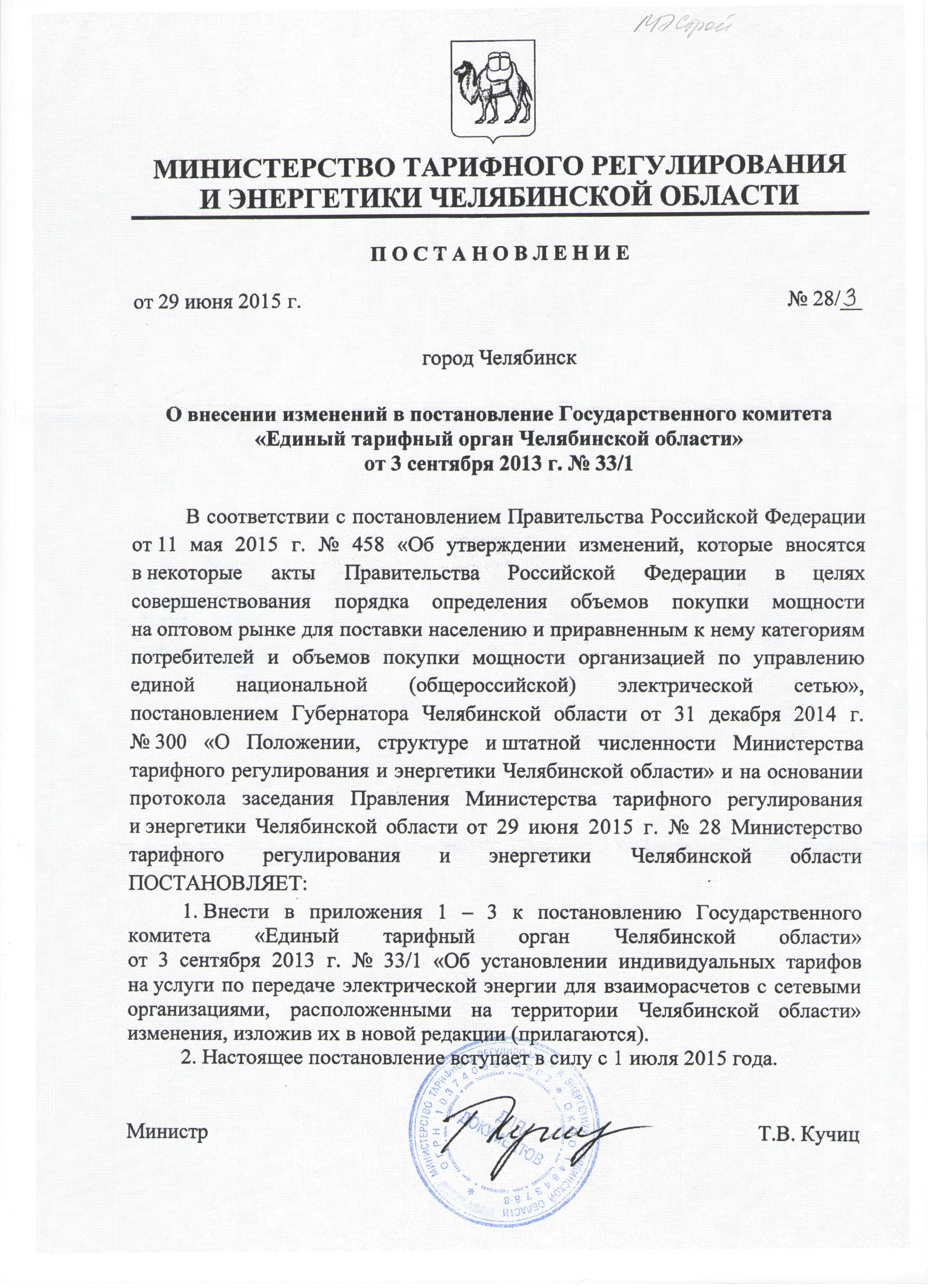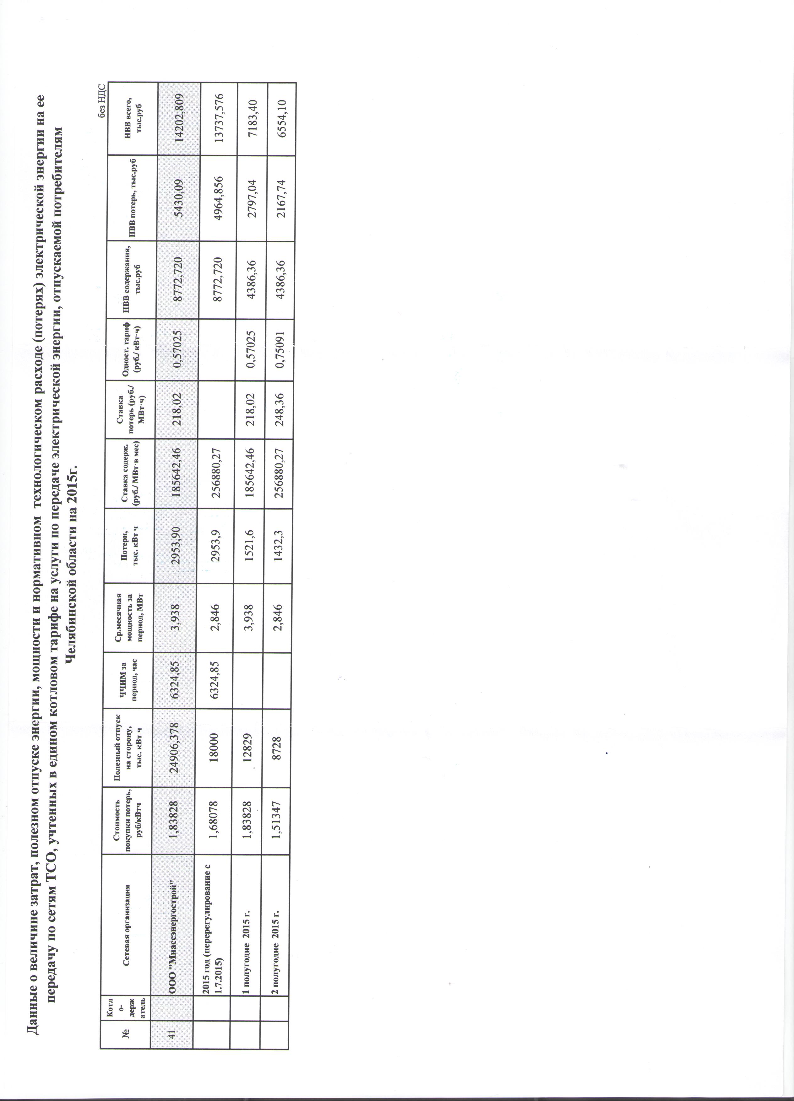 Заявление на изменение тарифа на передачу электроэнергии на 2015 год94.05 KB Скачать -Заявление на изменение тарифа на 2015 год Постановление Правительства РФ от 27 декабря 2004 г. N 861891.26 KB Скачать -Постановление Правительства РФ от 27 декабря 2004 г. N 861 Тариф на услуги по передаче электрической энергии на 2015 год2.84 MB Скачать -Тариф на передачу электрической энергии за 2015 год Постановление МТРиЭ Челябинской области на 2 полугодие 2015г1.95 MB Скачать -Постановление МТРиЭ Челябинской области на 2 полугодие 2015г Тариф на услуги по передаче электрической энергии на второе полугодие 2015 год492.45 KB Скачать -Тариф на передачу электрической энергии на второе полугодие 2015 год